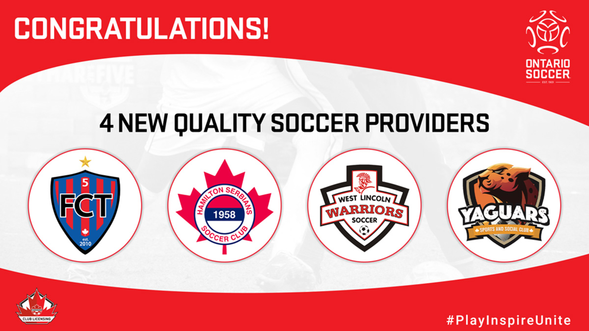 Entre los clubes reconocidos como Quality Soccer Providers (Proveedores de Fútbol de Calidad) se encuentran Futsal Club Toronto, Hamilton Serbian Youth Soccer Club y West Lincoln Youth Soccer Club en Ontario, así como Sportify Soccer Club y Vancouver Rangers Football Club en Columbia Británica (canadasoccer.com).